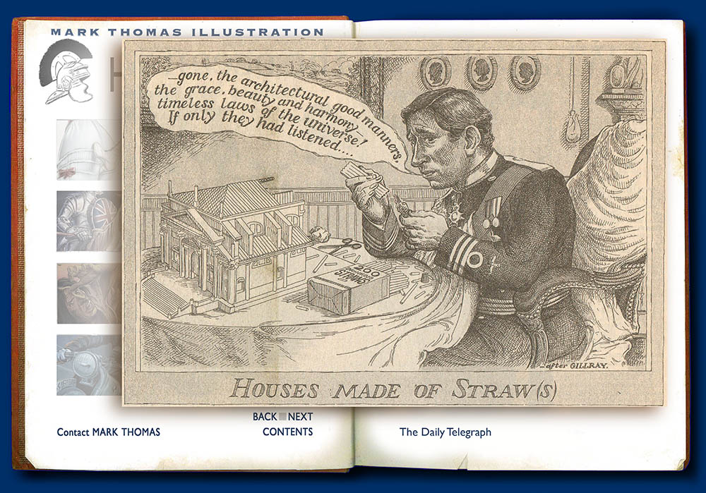 Edwardian Underpinnings Jousting Shining Future Don Quixote If only they had listened… Saxons and Romans The Meteorite West meets East Geisha Times Coward at the Bridge Coronation Mugs Euro Cowboys BACK NEXT Contact Mark Thomas Back to Contents NEXT Enlarge Image Prince Charles, The Prince of Wales, Gillray. History Illustration by Mark Thomas. Please note this is a UK based all image site