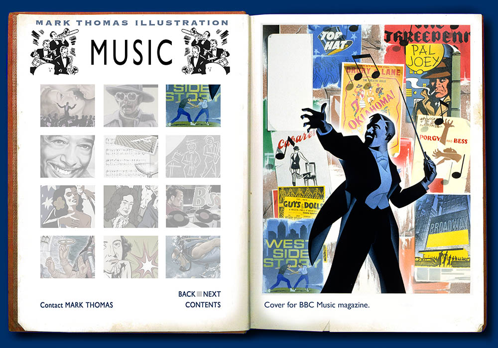 Film Music SuperBad Broadway Musicals Duke Ellington I Left My Heart in San Francisco Benny Green Ernesto Lecuona BBC Radio 3 Attack of the Killer B's Bombay Beats Radio 3 The Leisure Society BACK NEXT Contact Mark Thomas Back to Contents NEXT Film Music.Music Illustration by Mark Thomas. Please note this is a UK based all image site